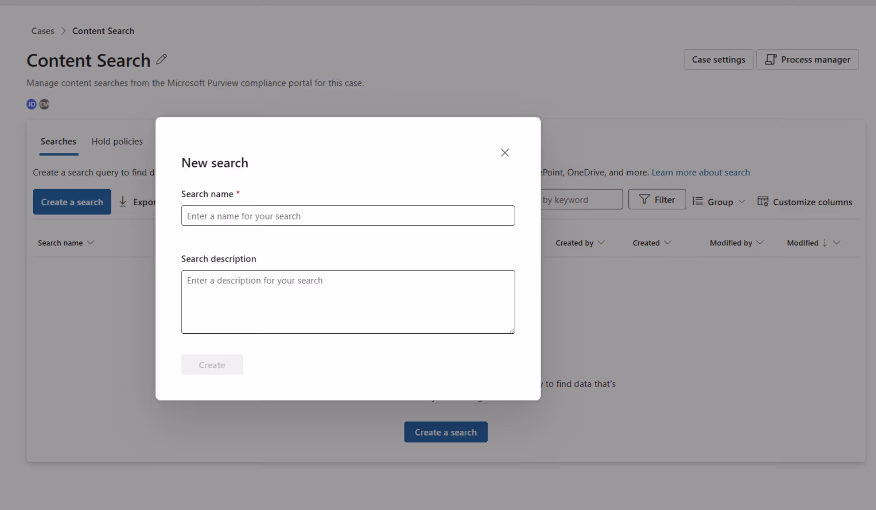 On the Content Search page, click on Create a search.