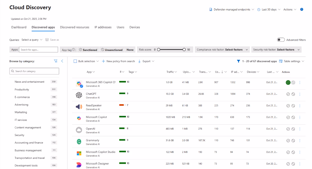 - Click on Cloud discovery. Here, you can filter discovered apps by category, including generative AI.