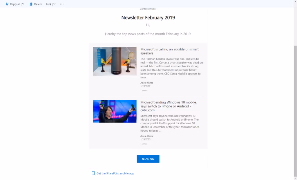 Once again, the SharePoint mobile app serves as a major adoption booster. Each time a news item is published, a notification is sent to all users, which is an excellent way to bring people back to your SharePoint portals. That said, your business users do need to accept the notification and install the SharePoint app. Another adoption boost is the news digest feature, which we mentioned earlier in the post. Again, it’s a great way to bring people back to your SharePoint.