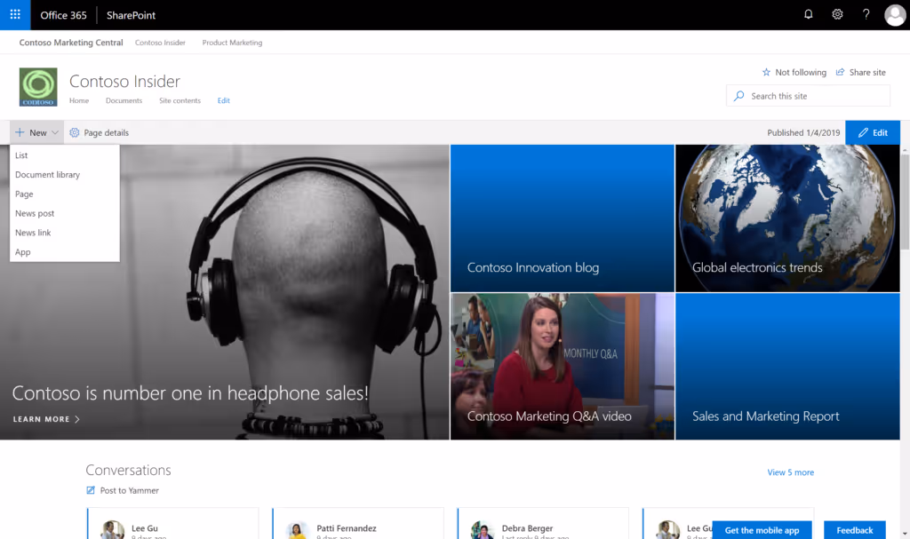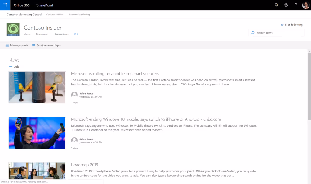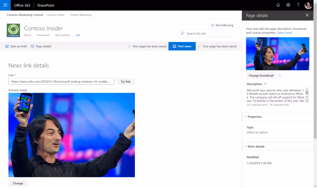 Modern SharePoint news pages are out-of-the-box responsive and integrated with the free Microsoft SharePoint app. This is huge! Not too long ago, you had to hire a developer to make your SharePoint pages responsive and usable on a mobile device.