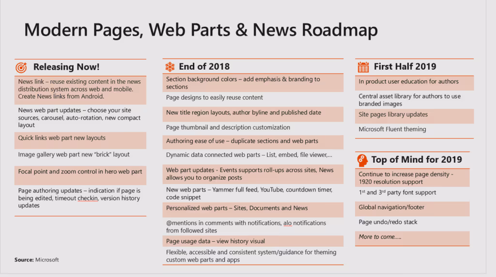 Modern SharePoint news pages are here to stay. That’s for sure. Are they perfect? Definitely not! But the steps Microsoft has taken since the feature was first released are impressive—and according to the roadmap below (from Ignite 2018), it's only going to get better.