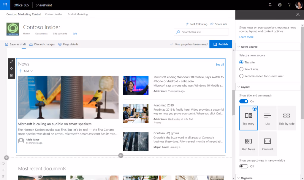 You can get creative with the different layout options. In the following example, we combined two news web parts with the carousel and list (compact) view: