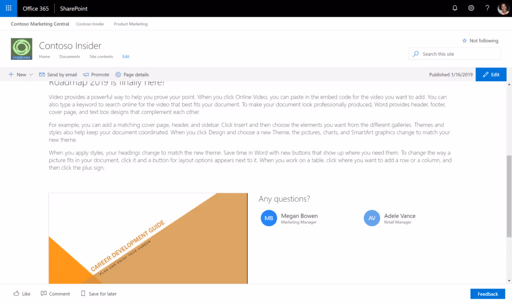 Once you’ve published the news post, it’ll automatically be displayed on the home page of your SharePoint site, where your colleagues will be able to view it, leave a reply, like it, or save it for later. Posts that are saved for later can be accessed via SharePoint home: