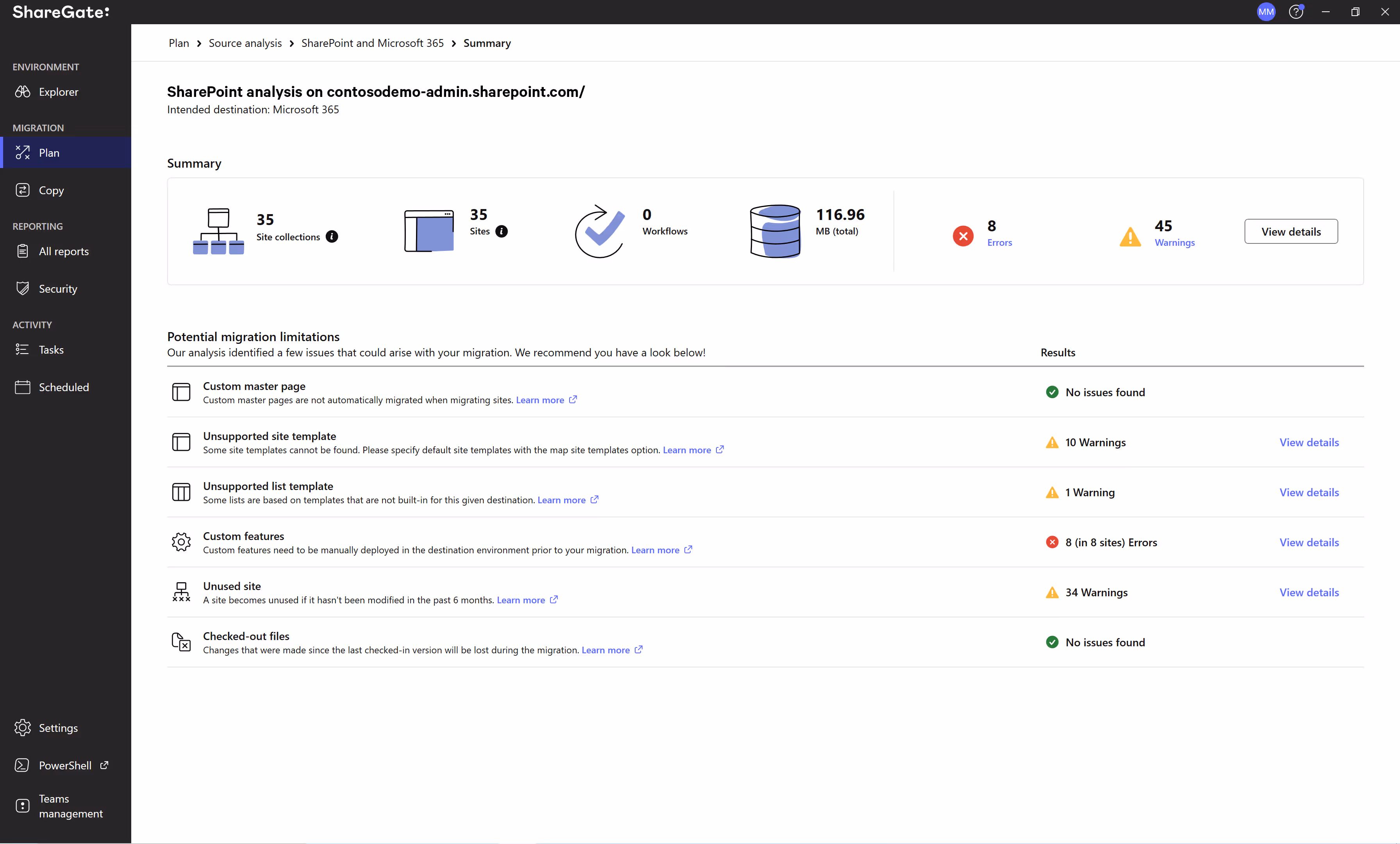Conducting this assessment can be a big task, but migration tools can help. For example, ShareGate’s inventory and analysis features (as part of its migration toolset) can scan your environment and produce reports of sites, size of content, unused or orphaned data, and more. (If you don’t have a tool yet, even a manual spreadsheet tracking these elements is better than nothing!) The outcome of this assessment is essentially your “migration inventory” and a clearer picture of the project’s magnitude.