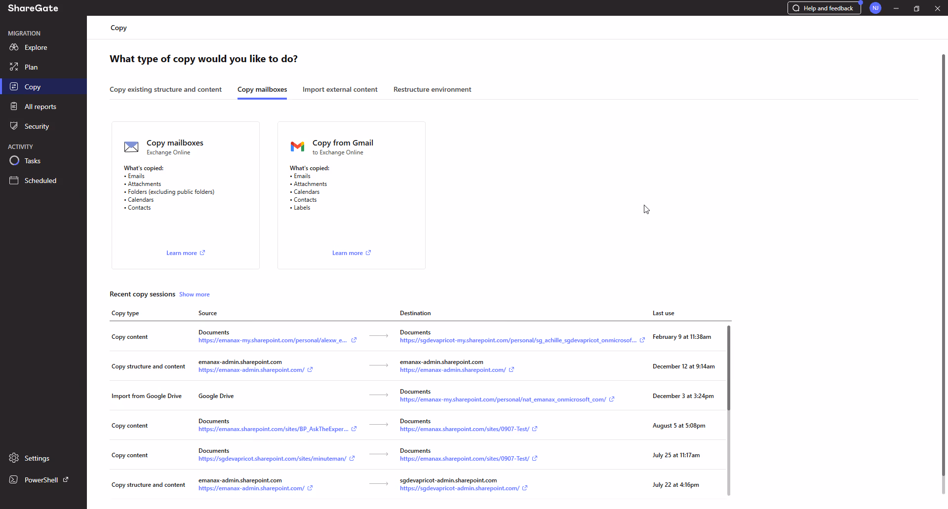 - PowerShell commands—use ShareGate’s PowerShell module to schedule and customize cross-tenant mailbox migrations.