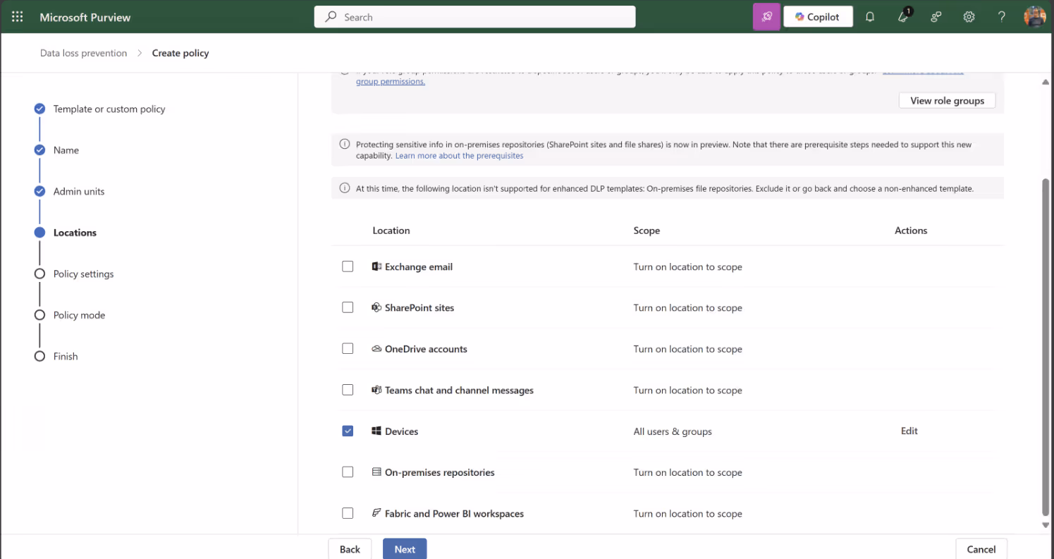 Once your devices are onboarded in Microsoft 365, you can connect them to Microsoft Purview by enabling device onboarding in the settings. With devices onboarded, you’ll be able to create DLP policies to monitor activity. Be sure to select Devices as the location in your policy: