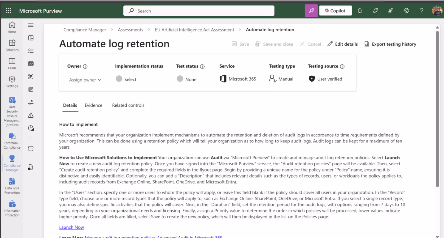 Even better—Purview Compliance Manager gives you improvement actions, complete with explanations and implementation steps, so you’re not guessing what to do next.