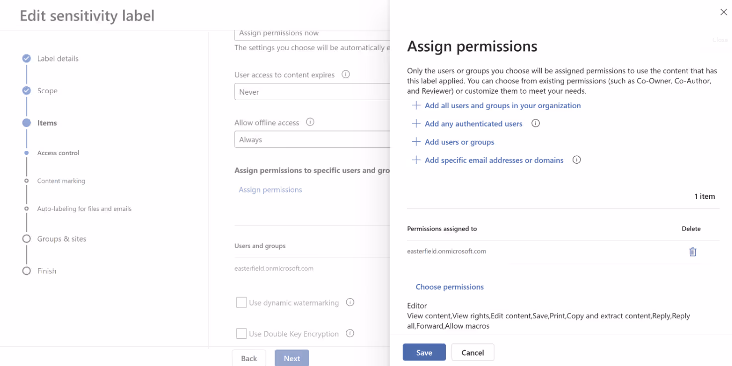 With MIP, you can use sensitivity labels to classify and protect sensitive information. Each label can be tied to specific users or groups with a defined permission level. For example: