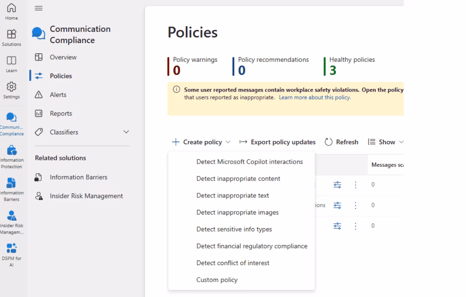 This one does exactly what the name says. It’s an insider risk solution that helps detect, capture, and act on potentially risky communication within your organization. It’s powerful and comes with a few default policies to get you started.