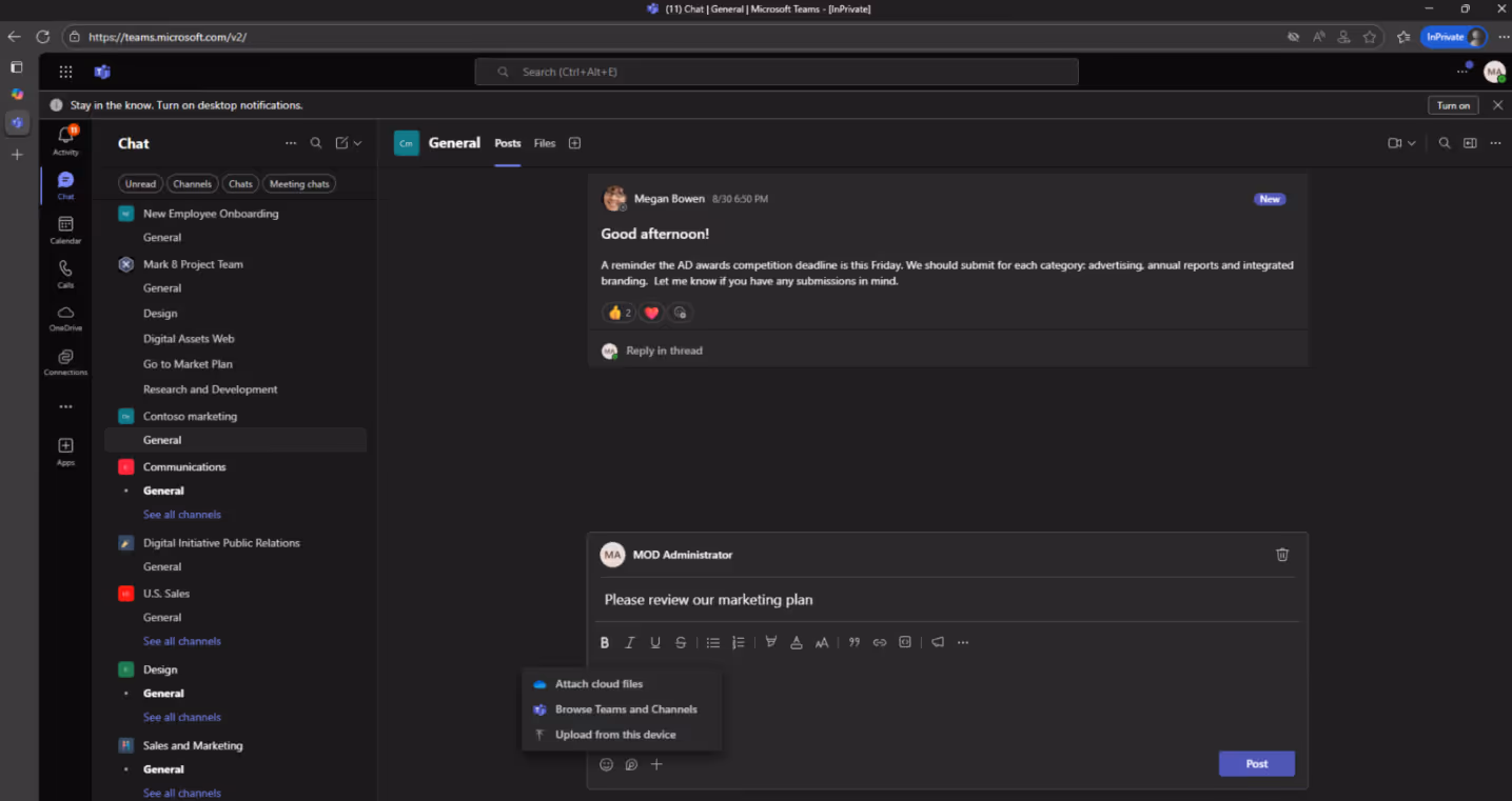 Use channels for focused conversations and collaboration surrounding a given topic. In this scenario, we're concerned with the go-to-market plan for the XT1050. Emily, your manager, put you in charge of delivering the XT1050 go-to-market presentation. You’ve already created the presentation with the help of your colleague Joni in OneDrive. Now it's ready to be shared with the rest of the team.