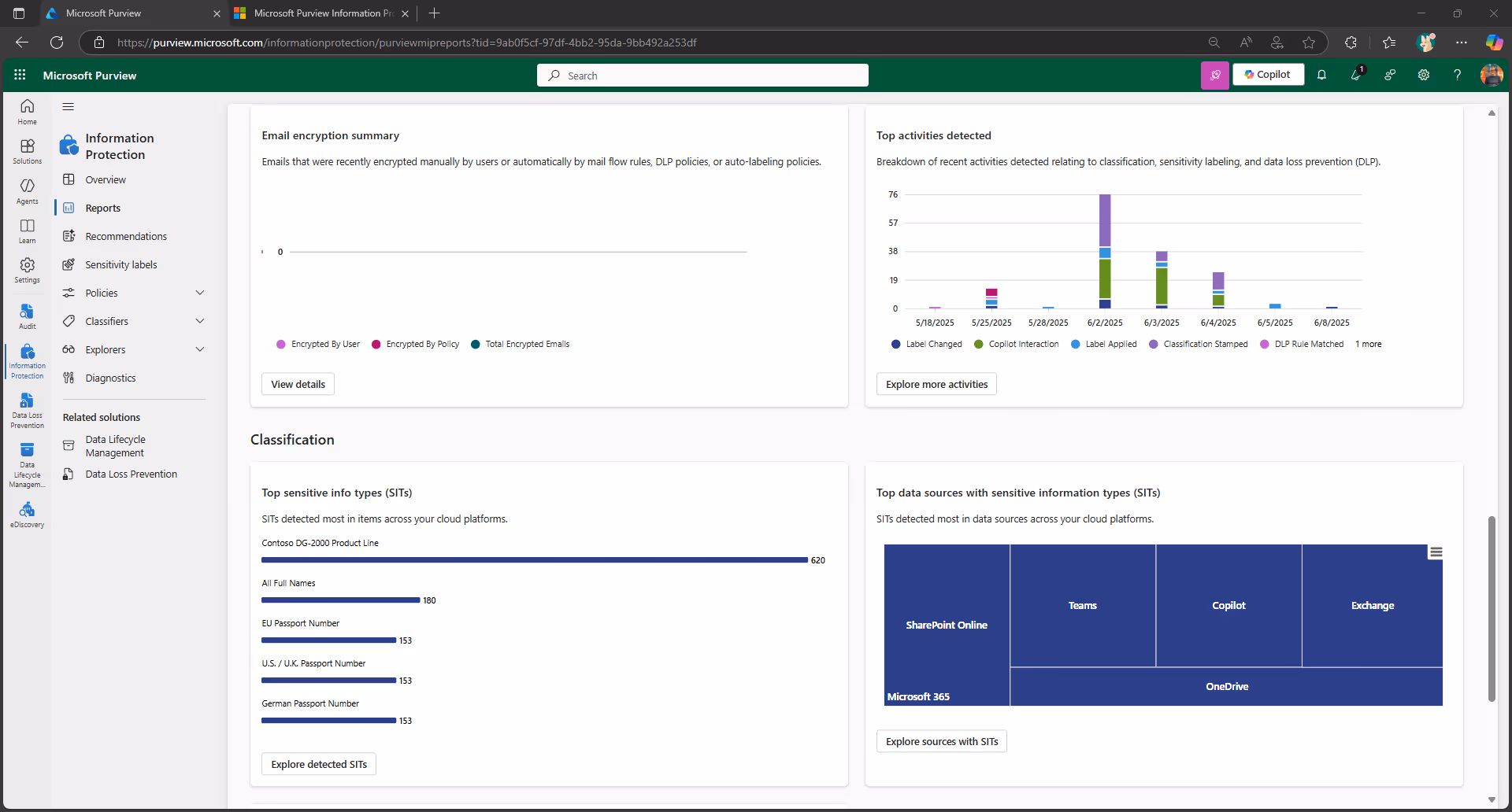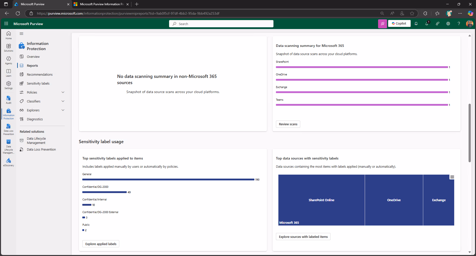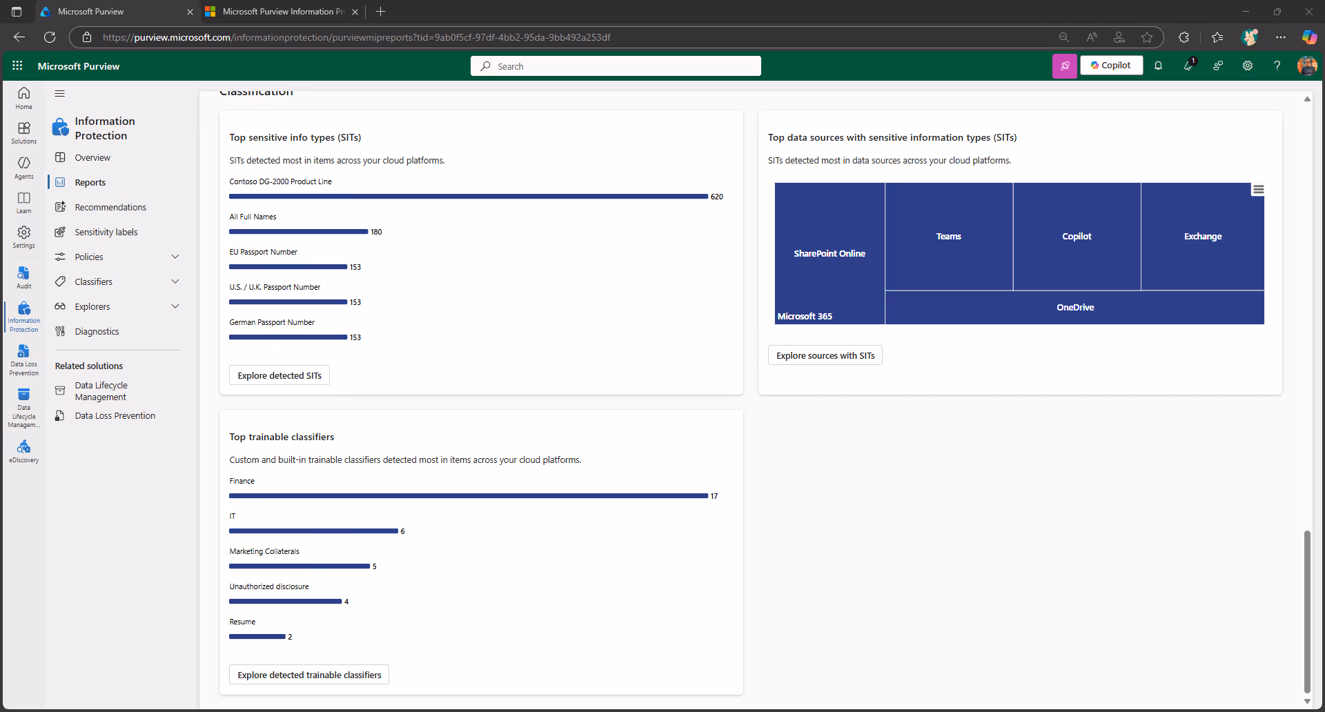 Once you’ve created your retention and sensitivity labels, you can track how they’re being used across your tenant on the Data classification page in your Microsoft Purview admin center.