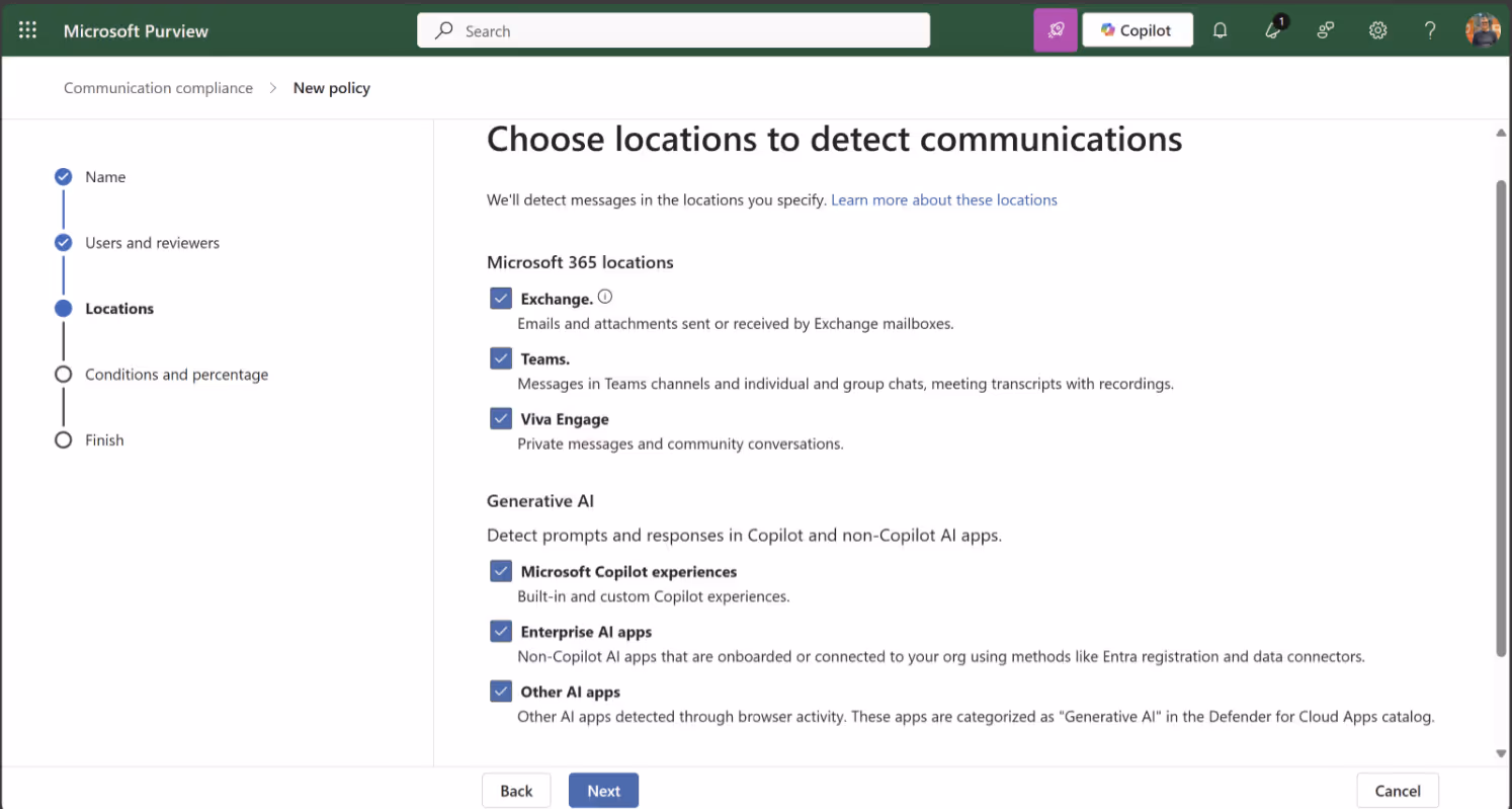 8. On the Choose locations to detect communications page, set "Microsoft Copilot experiences as the default communication channel: