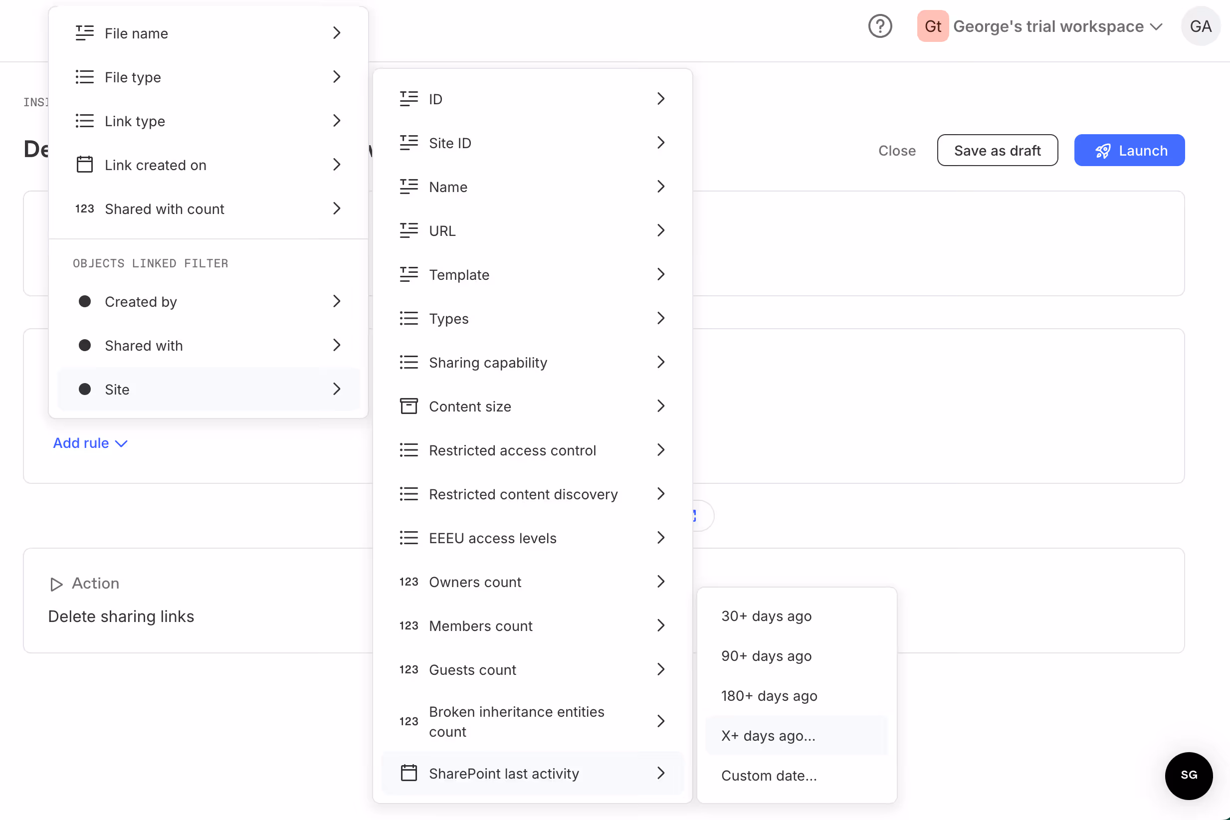 Target links by age, by who created them, by who they were shared with, or by the activity level of the associated site. Stack conditions to get as specific as you need. Before you launch, Protect shows you exactly how many links your rules will match. You can always click through to a full report to sanity-check the list before anything gets deleted.