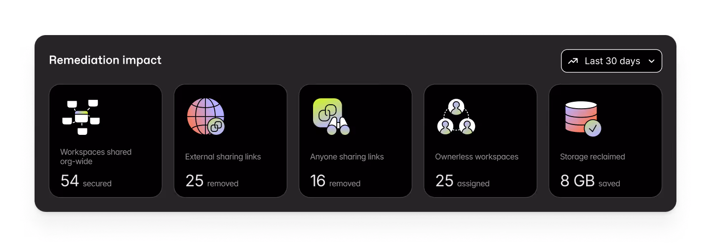 Remediation impact closes that loop. When you take action in Protect—removing sharing links, cleaning up org-wide access, archiving inactive workspaces—you can now see how those actions have moved the needle over time.