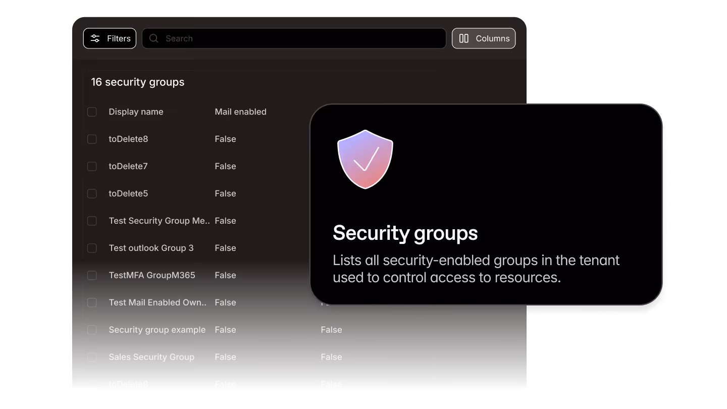 Protect now gives you a centralized, structured inventory of all M365 security groups in your tenant: display name, whether the group is mail-enabled, whether membership is dynamic or assigned, and a unique group ID. Filter it down. Export it out. Show your future self you had it under control.