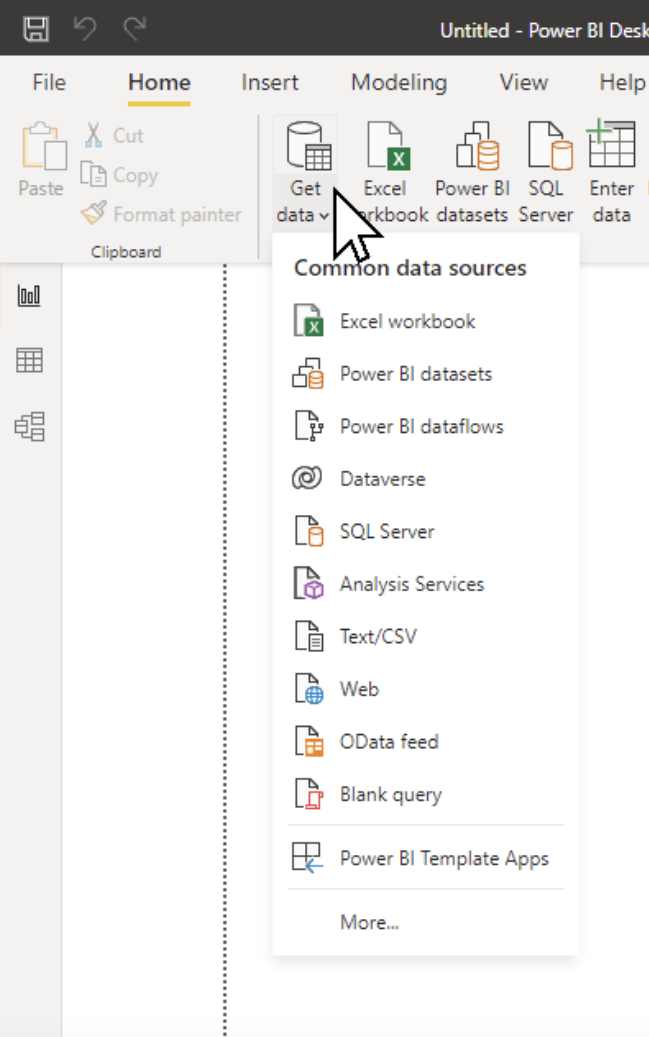 Once Power BI is open, click the Get Data button from the Home tab on the ribbon to access the available data sources.