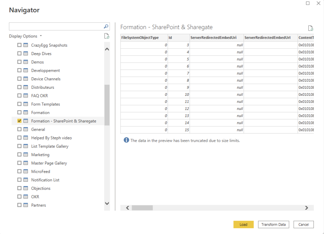 On the left side, select the relevant folder or list. A preview of the data that can be loaded should appear in the Navigator window.