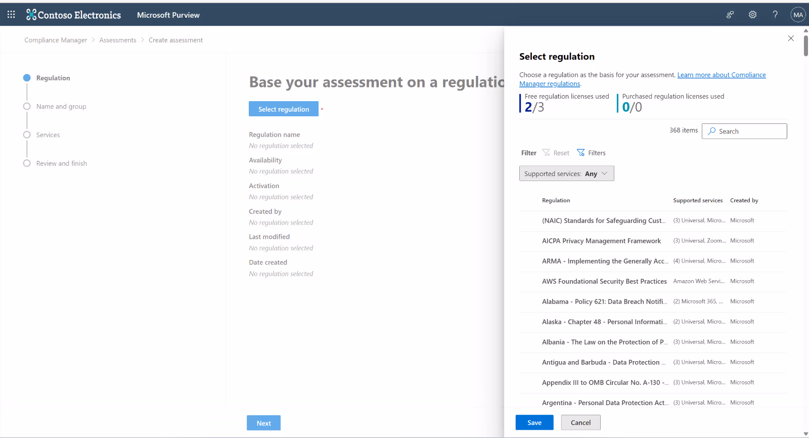 Microsoft provides 368 regulations for assessment. You can also create custom assessments based on existing regulations.