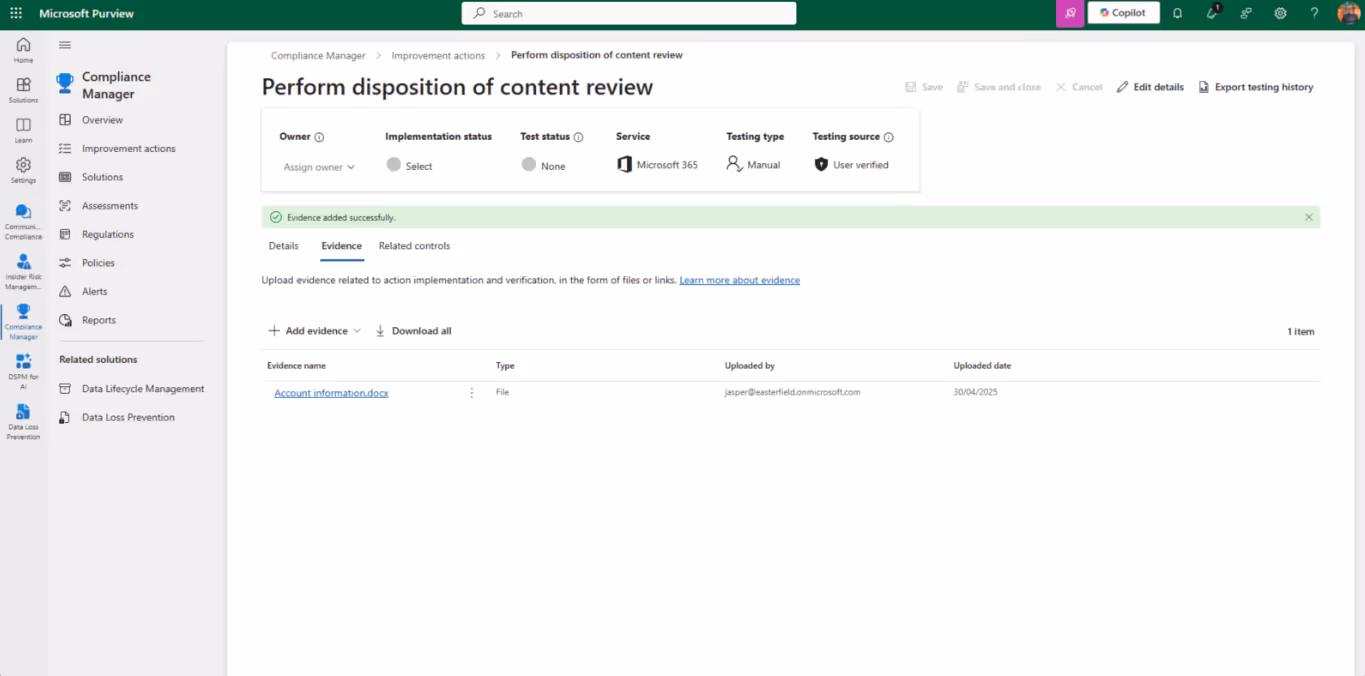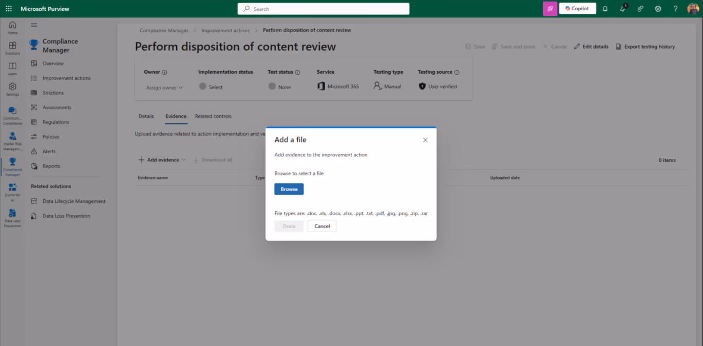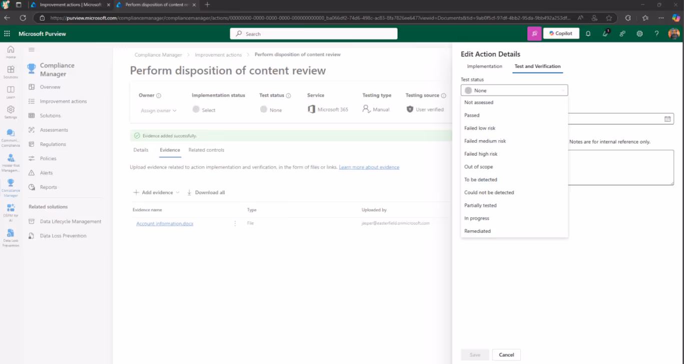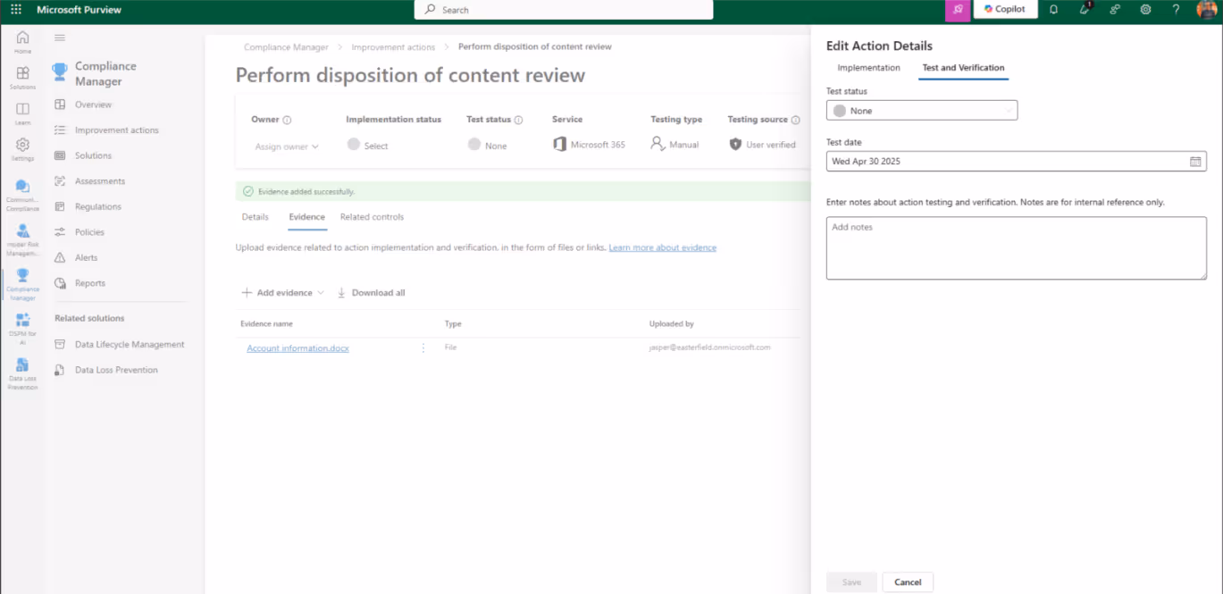 Testing source: Compliance Manager offers options for how to test improvement actions. My suggestion? Go automated. It's a time-saver. Automate testing and monitoring of key improvement actions, without the manual effort, allowing you to maximize efficiency in your compliance activities.