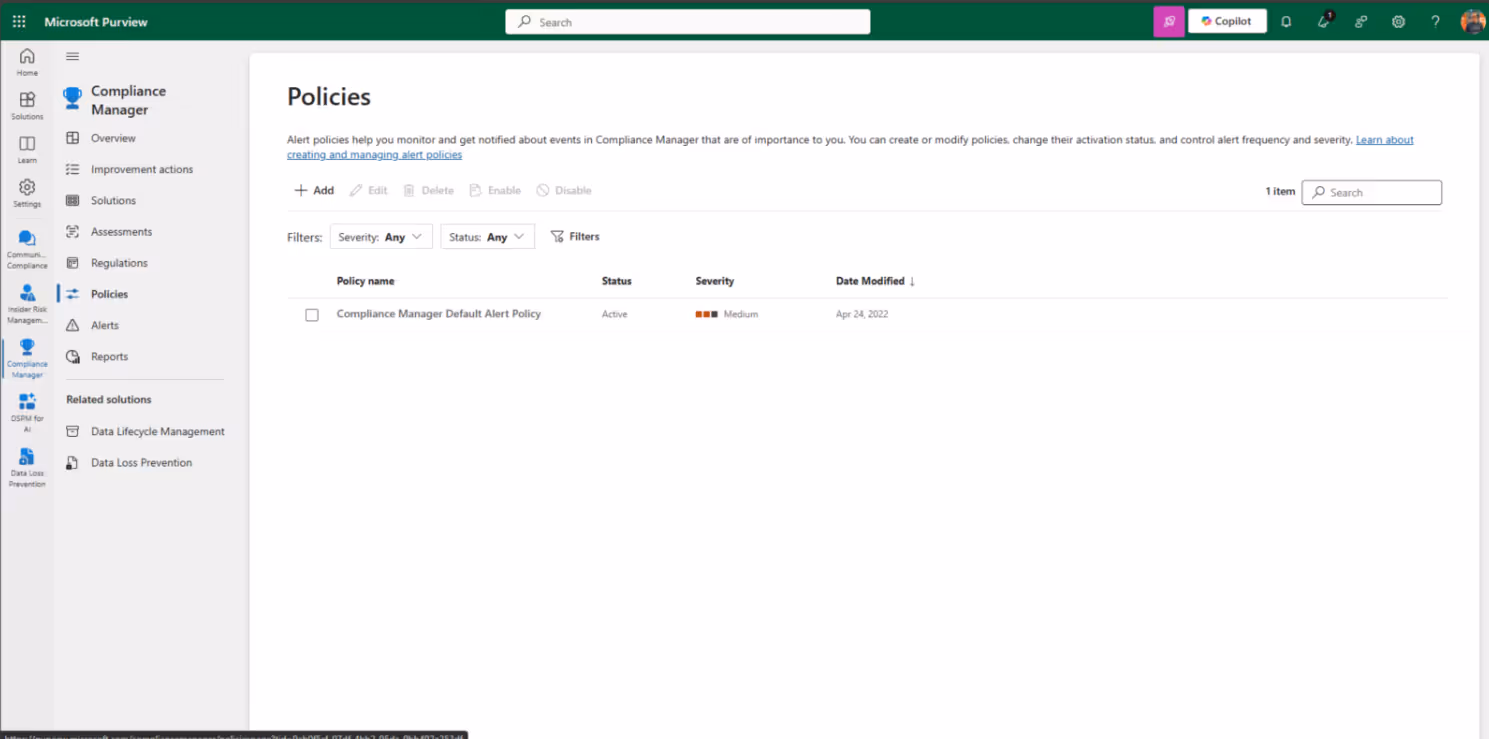 Alert policies help you monitor and get notified about important events in Compliance Manager. You can create or modify policies, change their activation status, and control alert frequency and severity.