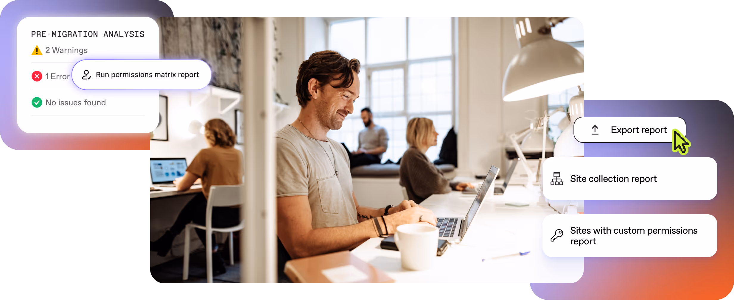 Get crystal-clear reports on sites, teams, and permissions before you move a single file, then bulk-fix what matters for a flawless migration.