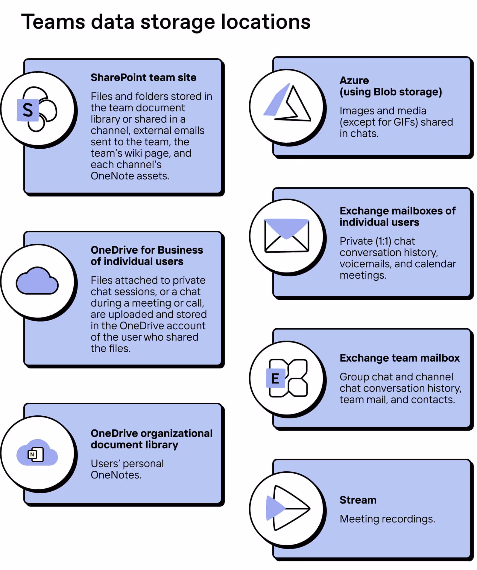 Before you can back up your data, you need to know where it’s stored. This is one of the primary challenges of performing a Teams migration because there’s no centralized location for all of your data in Teams. Depending on what you’re looking for, you’ll find it in various locations across your Microsoft 365 apps and tools.