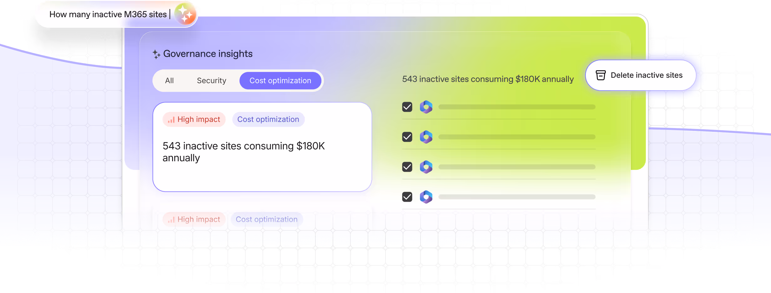 Use built-in Governance risk assessments and smart recommendations to find inactive workspaces, unused licenses, and hidden storage waste. Clean it up fast with bulk actions, optimize your tenant, and keep costs under control—no scripts required.