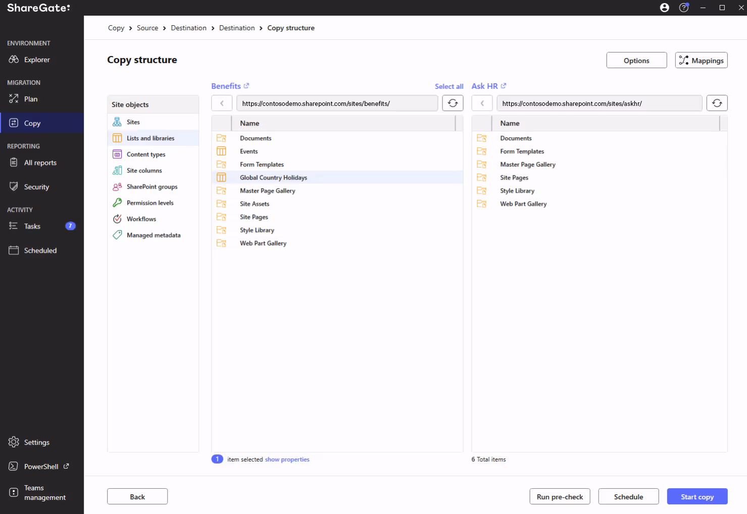 ShareGate’s migration tool takes the heavy lifting out of your migration project. Intuitive features help you prepare, execute, and validate your move, whether you’re migrating an entire environment or just a few lists.