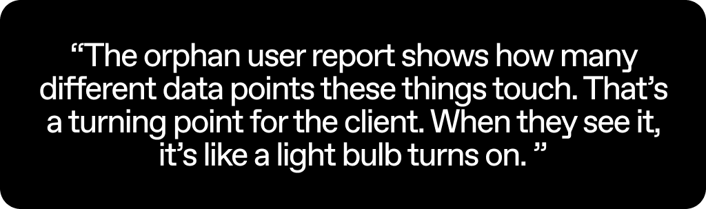 “One of the most helpful things ShareGate does is help me show the client how ugly their tenant might be. I can pull up a report and say, ‘These are all your orphan users, and just this one is touching all these other data points.’ And when they see that, it’s like a light bulb turns on and then they say, ‘Okay, yeah, let’s move forward.’”