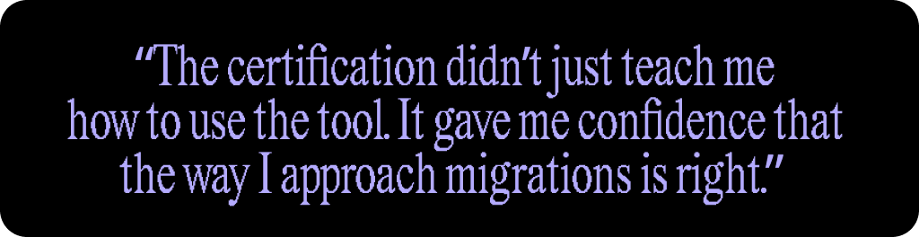 In these highly regulated, high-visibility projects, certification gives Sarah certainty that her migration approach has been tested and validated before she ever speaks to a customer.